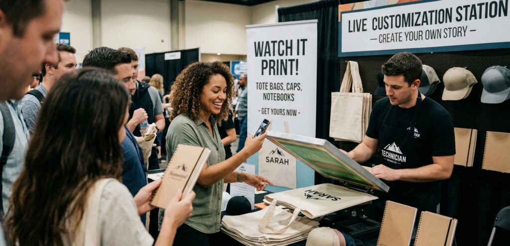 Live customization booths — where attendees watch their name or message printed onto a tote bag, cap, or notebook in real time — generate significant foot traffic and social sharing. The giveaway item becomes a story, not just an order.